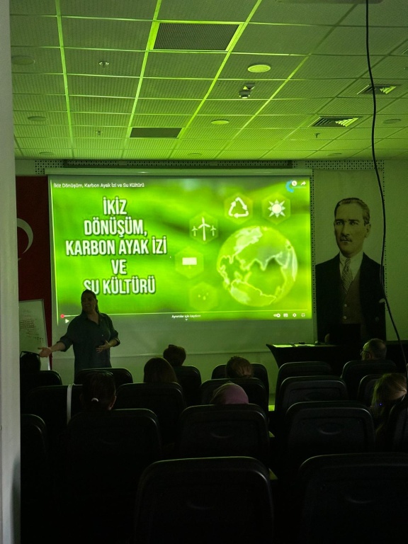 Seminer haftası çalışmaları kapsamında idareci ve öğretmenlerimize Biyoloji öğretmenimiz Zehra TORUN tarafından Sürdürülebilir Gelecek konularını içeren ikiz dönüşüm, karbon ayak izi ve su kültürü konularında seminer verildi